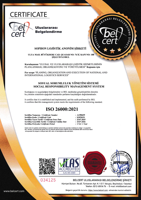 Sophon Lojistik küresel normlara uyumunu kanıtlayan çeşitli belgelerle donatılmıştır. Kalite yönetim sistemimiz süreçlerimizi düzenli kılarak hataları önlüyor ve memnuniyeti artırıyor; müşteri isteklerinden zincir yönetimine kadar her alanı kapsıyor.